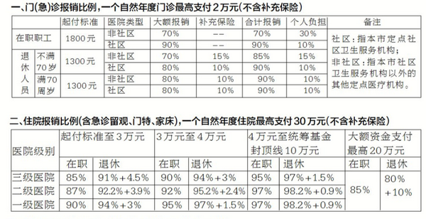 同样是一名患者,住院的报销比例与门诊不一样,一年内第一次住院和第二次及之后的住院起付线也不一样。同样是第一次住院,在职的医保患者与退休的医保患者报销的比例还不一样。医保待遇详见下表。